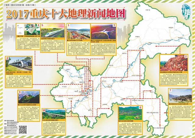 重慶日報(bào)訊 (記者申曉佳)2017年剛剛過去,哪些重要事件改變了我們的生活?1月3日,在重慶市規(guī)劃局指導(dǎo)下,重慶市地理信息中心、重慶地理學(xué)學(xué)會(huì)地理文化與科普專業(yè)委員會(huì)、重慶地理地圖書店聯(lián)合發(fā)布《2017重慶十大地理新聞地圖》,一圖呈現(xiàn)上述部門聯(lián)合評選的2017年發(fā)生在重慶的十大地理事件。中國(重慶)自由貿(mào)易試驗(yàn)區(qū)正式掛牌、云陽普安鄉(xiāng)發(fā)現(xiàn)世界級恐龍化石群、重慶江北國際機(jī)場T3A航站樓和第三跑道正式投入使用等均入選其中。