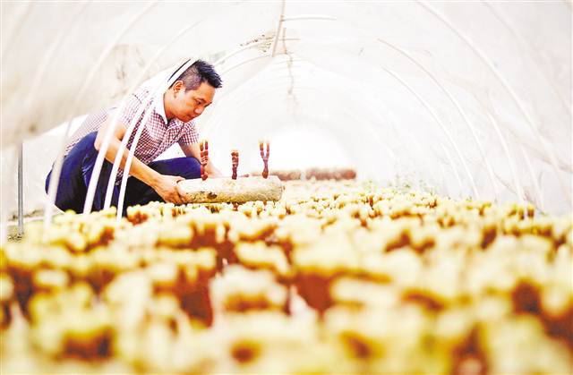 城口縣松坤菌草公司食藥用菌大棚內(nèi),公司負(fù)責(zé)人何立坤查看鹿角靈芝生長情況。(本組圖片為本報資料圖片,均由記者蘇思攝)