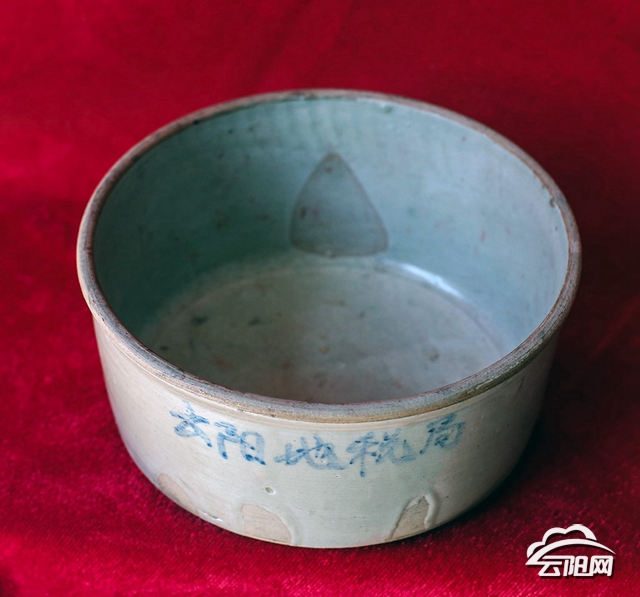 這只淺藍(lán)色的飯缽,口大底淺,質(zhì)地粗糙,而且還有不少瑕疵。飯缽?fù)饷嬗盟{(lán)色油性筆寫著“云陽地稅局”五個(gè)大字,顏色已逐漸裉去,從中也可看出這只飯缽經(jīng)歷了多少歲月,成了地地道道的“老物件”。