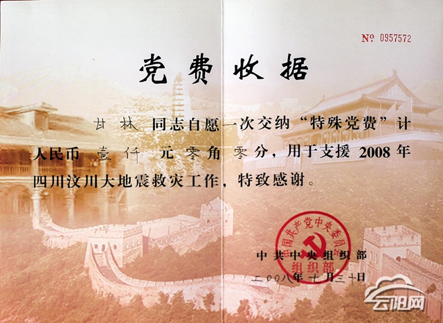 “聚少能成多,一千元做不了什么,但千千萬萬個(gè)一千元就很多了?!边@是甘林捐款時(shí),對(duì)募捐的同事說的一句話。此時(shí)他已身患絕癥,面臨每年10多萬元的醫(yī)療費(fèi)用支出。正如他所言,聚少成多,聚沙成塔,一筆筆捐款涌向汶川,汶川才能迅速重建。為鼓勵(lì)甘林無私奉獻(xiàn)的精神,中央組織部特為他開具了一份精美的、如證書般大小的“黨費(fèi)收據(jù)”,上面寫著:“甘林同志自愿一次交納‘特殊黨費(fèi)’計(jì)人民幣壹仟元零角零分,用于支援2008年四川汶川大地震救災(zāi)工作,特致感謝。”