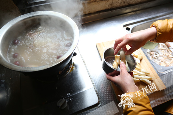 點(diǎn)火、架鍋、倒油,肉絲在熱油里被迅速翻炒,油煙里騰起陣陣香味。旁邊的燉鍋里,排骨湯咕嘟咕嘟冒著熱氣,再撒上一把蔥花,就可以起鍋了。