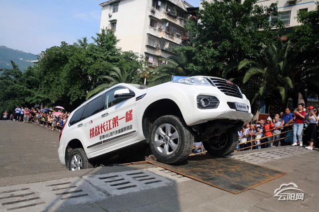 上午9點(diǎn)30分,開幕式廣場已是人山人海,而廣場上屹立在一旁的"挑戰(zhàn)長江第一梯"的紅色字樣牌子在烈日下顯得格外的醒目。車手在以無改裝越野車單車挑戰(zhàn)登云梯的形式,駕駛一輛哈弗H9越野車從群益廣場沿登云梯一路沿階梯上行,奮力攀爬至梯頂牌坊。挑戰(zhàn)賽賽道寬度為3米,從群益廣場至云頂廣場共有827步臺(tái)階,31個(gè)平臺(tái)。在現(xiàn)場觀眾的驚叫與喝彩聲中,哈弗H9成功征服素有長江第一梯之稱的重慶云陽登云梯。