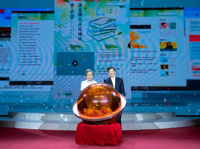 △中宣部副部長、中央廣播電視總臺臺長慎海雄,教育部部長陳寶生共同見證“中小學語文示范誦讀庫”首批100篇音頻教材正式上線發(fā)布。(攝影:新華社記者 沈伯韓)