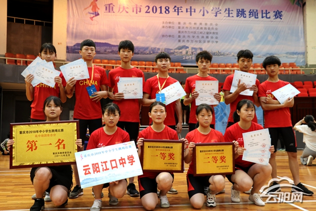 云陽(yáng)網(wǎng)訊(實(shí)習(xí)生 牟丹)近日,在重慶市2018年中小學(xué)生跳繩比賽中,江口中學(xué)校跳繩隊(duì)榮獲高中組集體跳長(zhǎng)繩一等獎(jiǎng)、高中組4x1分鐘接力跳繩二等獎(jiǎng)以及高中組團(tuán)體總分第一名。