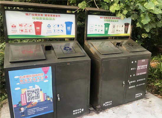 金鳳鎮(zhèn)自行設(shè)計(jì)、制作的腳踏式分類垃圾箱(初梓瑞 攝)