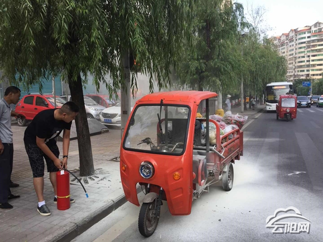 云陽(yáng)網(wǎng)訊(通訊員 周宇)8月13日上午,云陽(yáng)縣濱江路上,一輛滿(mǎn)載蔬菜的紅色電瓶車(chē)在馬路邊突然發(fā)生自燃。兩名駕車(chē)上班的民警遇見(jiàn)后,迅速買(mǎi)來(lái)滅火器上前救火,僅用3分鐘撲滅。
