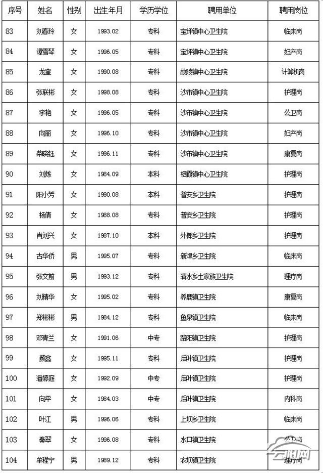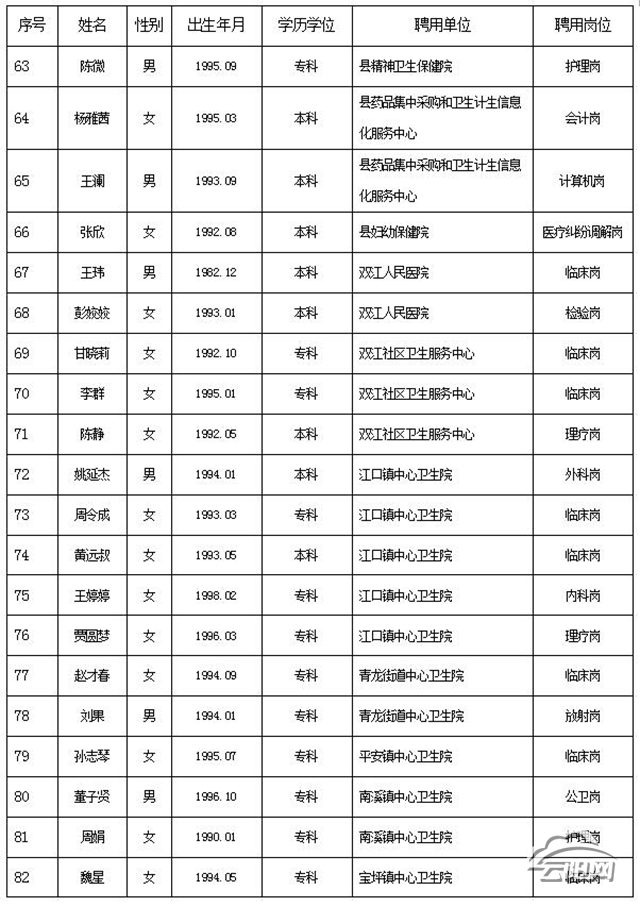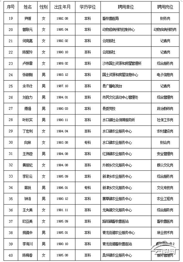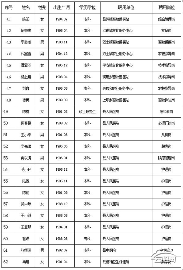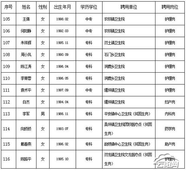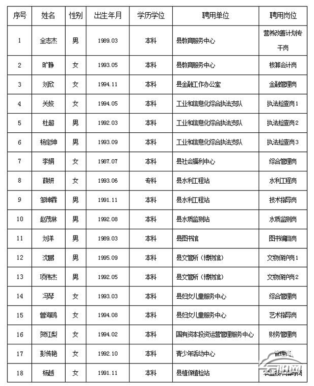 根據(jù)《云陽縣2018年上半年面向社會公開招聘事業(yè)單位工作人員簡章》精神,經(jīng)考試考核、體檢、考察合格,且公示無異議,現(xiàn)聘用全志杰等116名同志為事業(yè)單位工作人員。聘用時間從2018年8月起計算。所聘人員試用期12個月,若試用期滿考核不合格者,則取消聘用資格。