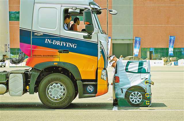 8月18日,兩江新區(qū)中國汽車工程研究院園區(qū),i-VISTA自動駕駛汽車挑戰(zhàn)賽上,工作人員正在測量重型卡車的比賽成績。記者鄭宇 攝