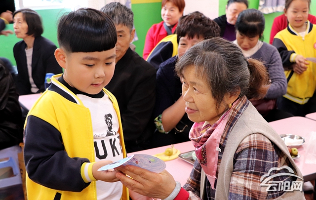 “重陽到,重陽到,爺爺奶奶節(jié)日好,我們非常感謝您,向你們節(jié)日問個好……” 爺爺奶奶們伴隨著兒歌入場。隨后,老師通過播放視頻,告訴孩子們重陽節(jié)的來歷和習(xí)俗,孩子們積極與老師配合回答問題,在互動中對節(jié)日知識有了全面了解。孩子們上臺表演了《好娃娃》和手語舞《感恩有你》等節(jié)目,向長輩們的陪伴和關(guān)愛表達感謝?;顒又校⒆觽儼察o地坐下來聽爺爺奶奶講述過去的故事,并為爺爺奶奶送上自己親自制作的賀卡和重陽糕。在互動游戲中,孩子們蒙上眼睛,根據(jù)老人的聲音辨別方向找到老人,引來了老人們陣陣歡笑聲 。