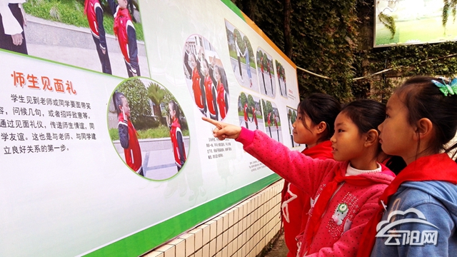 云陽網(wǎng)訊(記者 李充 通訊員 鄒春蘭)10月16日,鳳橋小學(xué)的校園內(nèi),一群小學(xué)生正在文化長廊前學(xué)習(xí)文明禮儀知識。