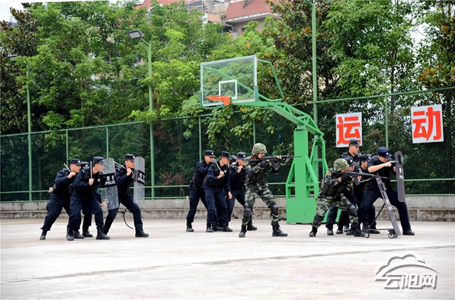 上午7:30,由縣反恐辦、公安局、應(yīng)急辦、教委、衛(wèi)計(jì)委、水務(wù)局、武警中隊(duì)等單位組成的12支方隊(duì)迅速整隊(duì)集結(jié)待命,接受檢閱。8點(diǎn)整,演練正式開(kāi)始,根據(jù)演練方案預(yù)設(shè)情節(jié),縣教師進(jìn)修學(xué)院的操場(chǎng)上,一個(gè)班的學(xué)生正在老師的帶領(lǐng)下上著體育課,5名暴恐分子砍傷保安后強(qiáng)行進(jìn)入學(xué)校,帶著砍刀、槍支、燃燒彈沖入學(xué)生群中揮刀砍殺,劫持一名人質(zhì)。公安局110指揮中心接到報(bào)警后,立即調(diào)集特警快反組、轄區(qū)派出所出警趕往現(xiàn)場(chǎng),根據(jù)現(xiàn)場(chǎng)情況,迅速啟動(dòng)反恐應(yīng)急預(yù)案;公安人員、談判專家趕到現(xiàn)場(chǎng)與暴恐分子對(duì)峙,做疏導(dǎo)勸解工作,隨著矛盾升級(jí),特警、武警迅速出擊,各單位多方配合,運(yùn)用多種戰(zhàn)術(shù)果斷將暴徒抓獲帶離現(xiàn)場(chǎng);醫(yī)療人員對(duì)現(xiàn)場(chǎng)受傷人員進(jìn)行救治;刑警人員對(duì)現(xiàn)場(chǎng)進(jìn)行勘察,辦理案件,整場(chǎng)演練成功結(jié)束。