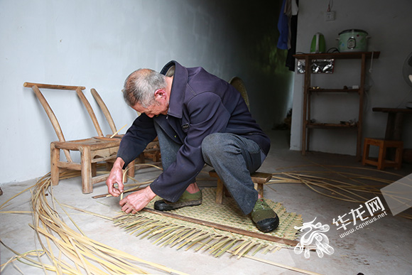 68歲的周明全在家中用篾條編制生活用品。 記者 劉嵩 攝
