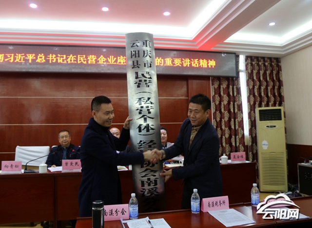 云陽網(wǎng)訊(實習生 鄭紅均)11月15日,云陽縣民營(私營個體)經(jīng)濟協(xié)會在南溪召開會議,學習貫徹習近平總書記民營企業(yè)重要講話精神,為南溪鎮(zhèn)分會授牌。