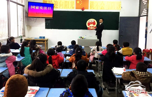 云陽網(wǎng)訊(記者 何競(jìng)嘉 通訊員 劉虎)12月3日,在第五個(gè)國家憲法日來臨之時(shí),縣第二人民法庭法官來到水磨小學(xué),開展憲法知識(shí)宣教行動(dòng),講解憲法知識(shí),舉行憲法宣誓,將法治意識(shí)永駐“童心”,用法治護(hù)衛(wèi)成長。