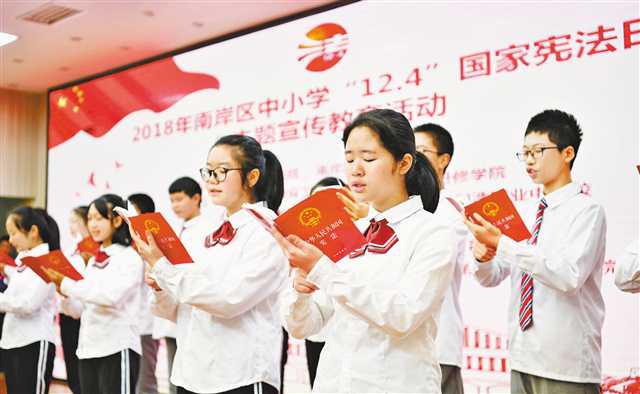 12月4日,南岸區(qū)中小學(xué)國家憲法日主題宣傳教育活動現(xiàn)場,學(xué)生集體誦讀《中華人民共和國憲法》。此次活動旨在進一步提高青少年法律意識和法治觀念,引導(dǎo)青少年知法、懂法、守法和用法。通訊員 郭旭 攝