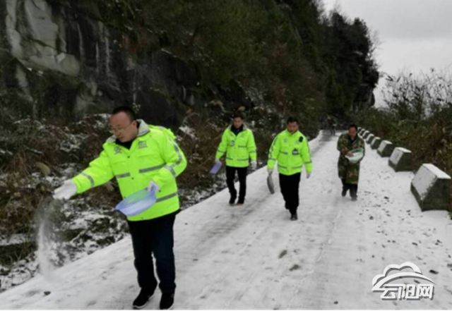 云陽(yáng)網(wǎng)訊(記者 李充 通訊員 伍遠(yuǎn)洋)1月3日,在大陽(yáng)鎮(zhèn)慶霞村一條山鄉(xiāng)公路上,該鎮(zhèn)組織的安監(jiān)辦人員和村社干部及群眾,采用撒鹽等技術(shù),清理路面積雪,確保道路交通安全。