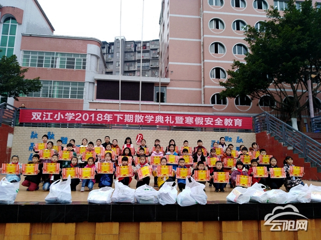云陽(yáng)網(wǎng)訊(實(shí)習(xí)生 鄧庭庭)1月24日,云陽(yáng)縣雙江小學(xué)2018年秋季散學(xué)典禮暨寒假安全教育大會(huì)在學(xué)校操場(chǎng)舉行。