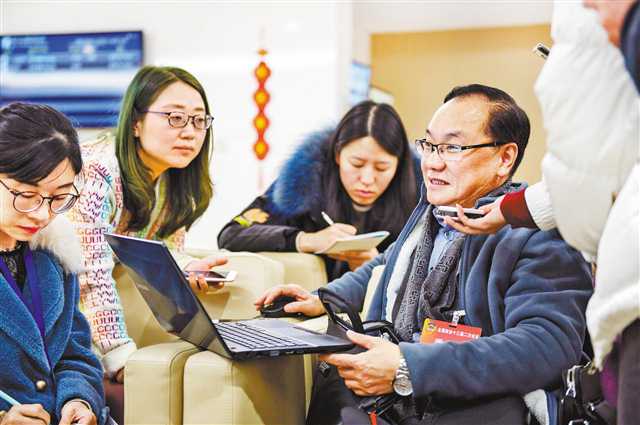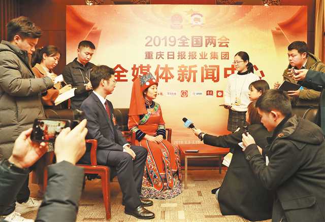 3月2日,重慶日?qǐng)?bào)報(bào)業(yè)集團(tuán)的全媒體記者正在采訪全國(guó)人大代表。當(dāng)日,重報(bào)集團(tuán)兩會(huì)報(bào)道北京全媒體新聞中心投入運(yùn)行。記者 巨建兵 攝