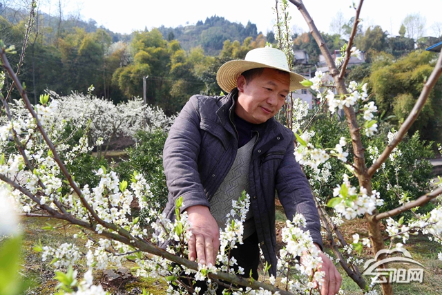 3月14日,黃文軍手拿鋤頭,挖窩后,小心翼翼地將果樹苗放入坑中,然后填土、澆水、踩實(shí)……他手腳麻利,一絲不茍地種下一棵棵李子樹苗。見到記者到來,他趕緊放下手中的鋤頭,笑瞇瞇地指著地里的一棵小李子樹說:“這些李子樹是我正月間剛種下的,等到5月份它就可以結(jié)果了。現(xiàn)在天氣好,我得再多種上幾棵!”