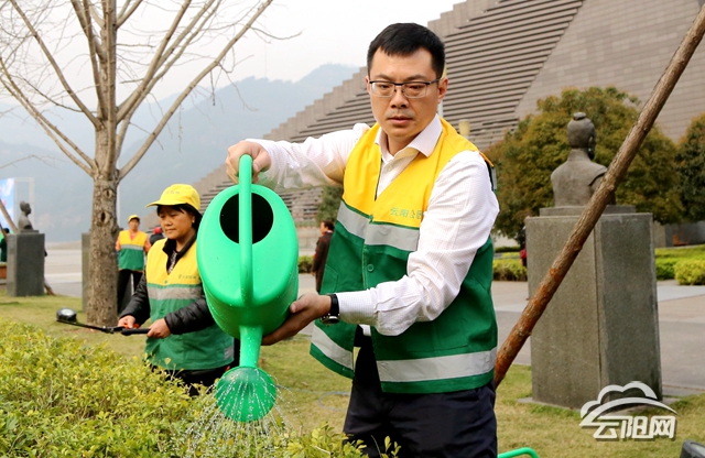 儀式結束后,覃昌德、吳久華、李大武、朱錫祥與志愿者一起參加了城市管理體驗活動,修剪了兩江廣場周邊綠化帶,并為周邊的花草澆水。