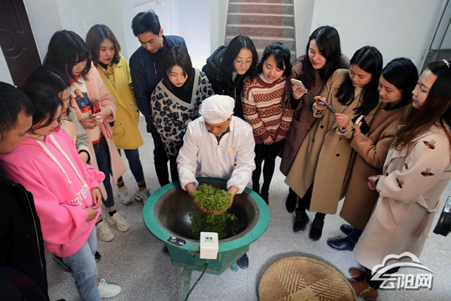 在手工制茶車間,工人師傅打開電炒鍋,當(dāng)燒到一定溫度后,一個(gè)工人師傅將游客采摘的茶芽倒進(jìn)鍋內(nèi)不停地翻轉(zhuǎn),一會(huì)兒,一股股濃濃的白煙從鍋中飄散出來,彌漫了整個(gè)車間,游客們呼吸著濃濃的茶香。