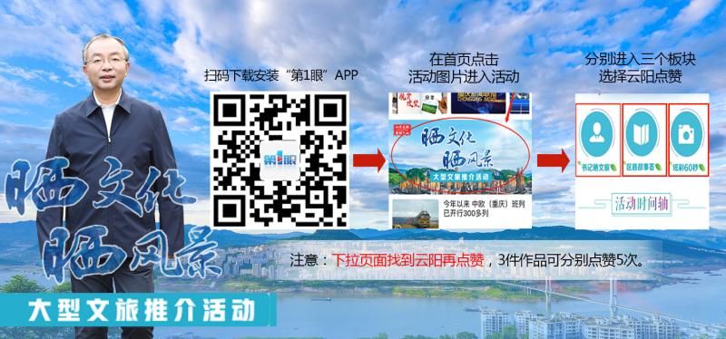 友情提示:云陽(yáng)參加的“曬文化.曬風(fēng)景”大型文旅推介活動(dòng)在”第1眼“客戶端有“書(shū)記曬文旅””區(qū)縣故事薈“”炫彩60秒“三個(gè)板塊,每天每個(gè)手機(jī)號(hào)碼可以各點(diǎn)5次贊!點(diǎn)贊投票將截止到4月4日,僅剩四天時(shí)間!