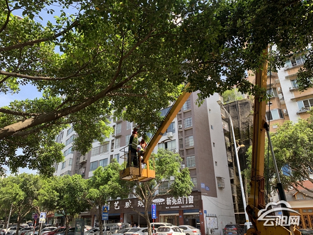 云陽網(wǎng)訊(記者 王彬彬)4月23日,在云江大道上,縣城管局公園管理所組織綠化工人開展行道樹管護(hù)工作。