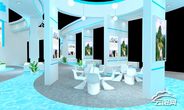 據(jù)了解,云陽展館總面積390平方米,展館分為商貿及農業(yè)產品展示區(qū)、工業(yè)板塊展示區(qū)、智能產品展示區(qū)、旅游展示區(qū)、洽談區(qū)、接待區(qū)等。展館主體造型運用了云陽著名景點龍缸云端廊橋為設計元素,以大氣科技感的藍白色為主色調,多處采用梯形的設計,引出云陽的梯城之名,地面長江流水的設計與頂上景點龍缸云端廊橋相呼應,使整體展臺與主題“萬里長江.天生云陽”相結合,點名主題寓意。農產品區(qū)運用了嫩芽發(fā)芽,向陽生長的設計理念,突顯出農產品的茁壯成長,寓意云陽的發(fā)展越來越好。