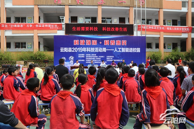 “跟著我左手右手一個慢動作……”隨著音樂的響起,機器人跟著節(jié)奏搖擺起舞姿。5月24日,由縣經(jīng)濟信息委(科技局)、縣科協(xié)主辦的“科技強國?科普惠民——云陽縣2019年科技活動周人工智能進校園”活動走進桑坪鎮(zhèn)團壩小學(xué),讓學(xué)生近距離感受科技的魅力,豐富校園文化生活。圖為工作人員為師生講解機器人的相關(guān)科學(xué)知識。(記者 何競嘉 攝)