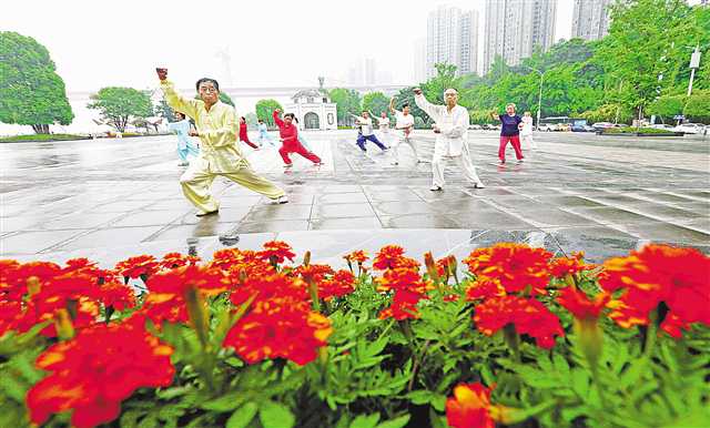6月10日,九濱路九龍外灘廣場(chǎng),市民在廣場(chǎng)上打太極拳健身。