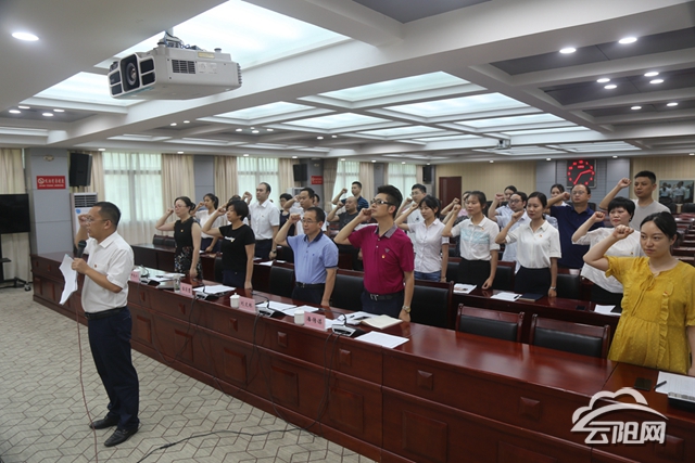 “我志愿加入中國共產(chǎn)黨……隨時準(zhǔn)備為黨和人民犧牲一切,永不判黨。”比賽前, 縣府辦全體黨員高舉右拳,重溫入黨誓詞。