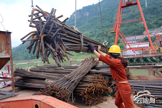 澎溪河多線特大橋位于黃石鎮(zhèn)境內(nèi),應(yīng)用了“港珠澳大橋”建設(shè)工序,由中鐵十一局集團(tuán)五公司承建,是重慶段全線重點(diǎn)、難點(diǎn)、控制性工程。該橋長741.6米,共14跨,是一座四線變二線道岔梁+連續(xù)鋼構(gòu)-拱組合大橋,其中主跨長度為200米,主墩在長江一級(jí)支流澎溪河中,三峽庫區(qū)蓄水時(shí)水位為172米至173.3米,枯水期最低水位143.33米,墩位處施工水域標(biāo)高位134.6米至174.46米,水位落差達(dá)30多米,為高樁承臺(tái)基礎(chǔ)。