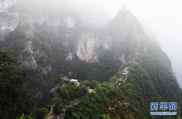 這是7月30日拍攝的霧中的云陽龍缸國家地質(zhì)公園。 云陽龍缸國家地質(zhì)公園位于重慶市云陽縣東南隅,深處三峽庫區(qū)腹心,景區(qū)內(nèi)地貌奇特、雄險俊秀、風(fēng)景壯美。 新華社記者王全超攝