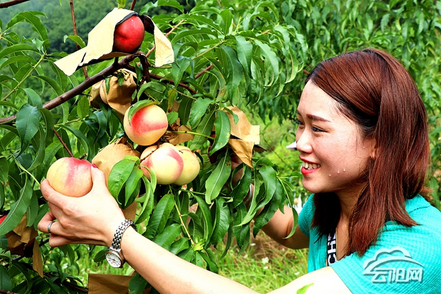 “這是我第二次來(lái)這里采摘桃子,我覺(jué)得‘秋芯紅’桃又大又甜,我今天準(zhǔn)備多摘一點(diǎn),給親朋好友帶回去?!庇慰陀谛〖t邊采摘桃子邊說(shuō)。