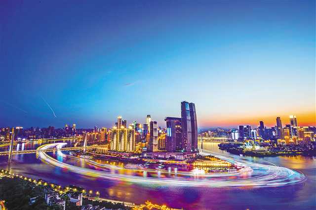 重慶夜景,游船在江面留下彩色光帶。記者 蘇思 攝