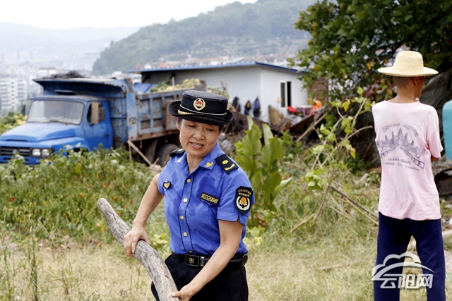 在拆違現(xiàn)場,盡管天氣炎熱,但隊員們的干勁十足,為城市形象在奉獻一份力。今年45歲的袁中菊是現(xiàn)場唯一一位女隊員,在烈日下,她依然堅守在崗位上,和男隊員一起抬著木棒放在一公里外的地方去,10分鐘不到,她的汗水早已順著帽檐淌了下來,衣服早已濕透。