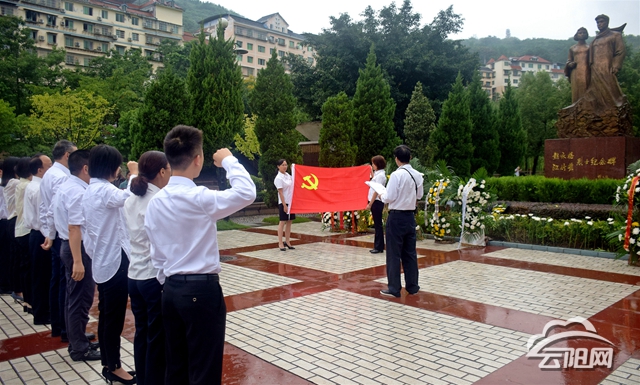 在彭詠梧、江竹筠烈士雕像前,黨員們敬獻花籃,深深鞠躬,懷著崇敬的心情緬懷革命先烈?!拔抑驹讣尤胫袊伯a(chǎn)黨……”在場機關黨員面對鮮紅的黨旗莊嚴肅穆地重溫入黨誓詞。