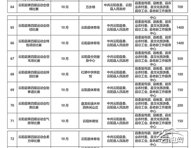 云陽(yáng)網(wǎng)訊(記者 何競(jìng)嘉)9月26日,記者從縣體育總會(huì)獲悉,10月份我縣將舉辦九項(xiàng)豐富多彩的體育賽事,掀起全民運(yùn)動(dòng)新熱潮。