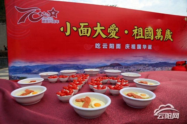 云陽網(wǎng)訊(記者 丁齊)過生日,吃一碗長壽面才有儀式感。為慶祝新中國成立70周年,10月1日,縣文旅委在云陽龍缸景區(qū)擺出一桌特殊的宴席,邀請廣大游客和居民參與‘小面大愛·祖國萬歲’吃云陽面,慶祖國華誕活動。