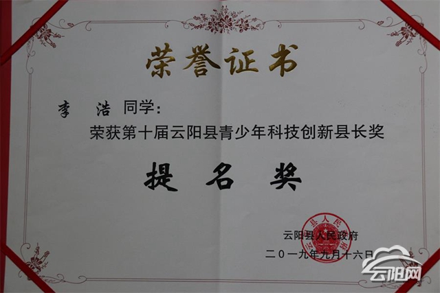 同年9月,李浩獲得第十屆云陽(yáng)縣青少年科技創(chuàng)新縣長(zhǎng)獎(jiǎng)。李浩還被學(xué)校評(píng)為“三好學(xué)生”,學(xué)習(xí)成績(jī)、發(fā)明創(chuàng)造一樣都不落下。