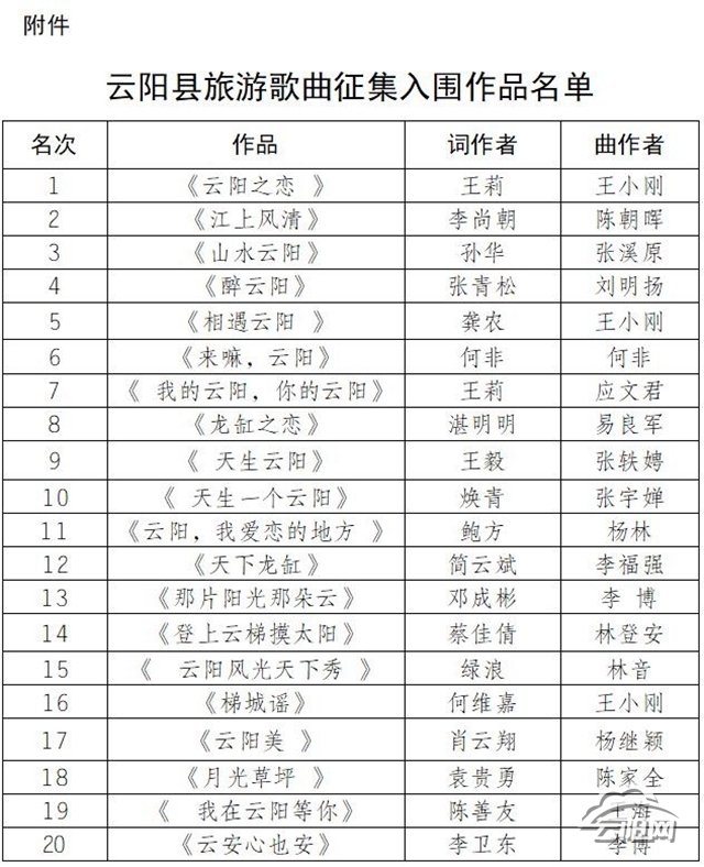 此次活動共征集了來自全國23個省市自治區(qū)413首歌曲,經過初審、專家初評和專家復評層層篩選,評選出了優(yōu)秀歌曲20首,再由市民投票,根據(jù)得票數(shù)進行量化計分得出排名。其中,王莉作詞、王小剛作曲的《云陽之戀》榮獲金獎;李尚朝作詞、陳朝暉作曲的《江上風清》,孫華作詞、張溪原作曲的《山水云陽》,張青松作詞、劉明揚作曲的《醉云陽》,龔農作詞、王小剛作曲的《相遇云陽》榮獲銀獎;何非作詞作曲的《來嘛,云陽》,王莉作詞、應文君作曲的《我的云陽,你的云陽》,湛明明作詞、易良軍作曲的《龍缸之戀》,王毅作詞、張軼娉作曲的《天生云陽》,煥青作詞、張宇嬋作曲的《天生一個云陽》榮獲銅獎;其他10個作品榮獲優(yōu)秀獎。