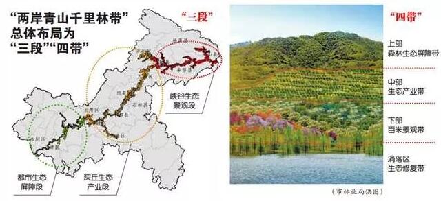 “兩岸青山千里林帶”總體布局為“三段”“四帶”。其中,“三段”具體是:峽谷生態(tài)景觀段(包括云陽、奉節(jié)、巫山、巫溪4個縣),結(jié)合生態(tài)旅游重點打造三峽紅葉景觀與脆李、臍橙等生態(tài)林;深丘生態(tài)產(chǎn)業(yè)段(包括長壽、涪陵、武隆、豐都、忠縣、石柱、萬州、開州8個區(qū)縣),結(jié)合生態(tài)產(chǎn)業(yè)重點布局柑橘、筍竹等特色經(jīng)果林,兼顧生態(tài)景觀林打造;都市生態(tài)屏障段(包括永川、江津、巴南、大渡口、九龍坡、南岸、江北、北碚、沙坪壩、渝北10個區(qū)),結(jié)合城鎮(zhèn)污染防控措施重點提升城市生態(tài)屏障功能,兼顧景觀品質(zhì)與特色經(jīng)果林發(fā)展。