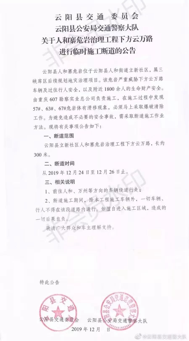 2019年12月24日至12月26日止,云陽(yáng)縣立新社區(qū)人和寨危巖治理工程下方云萬(wàn)路,長(zhǎng)約300米路段將繼續(xù)斷道施工,斷道期間除本工程施工車(chē)輛外,一切車(chē)輛、行人不得在該段道路內(nèi)通行,請(qǐng)前往人和、萬(wàn)州等方向的車(chē)輛繞道行走,感謝廣大群眾和駕駛?cè)死斫夂椭С帧?/p>