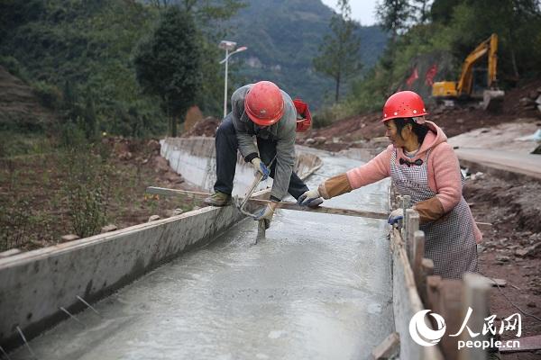 陳朋(左)在村里的工地上務(wù)工。劉政寧攝