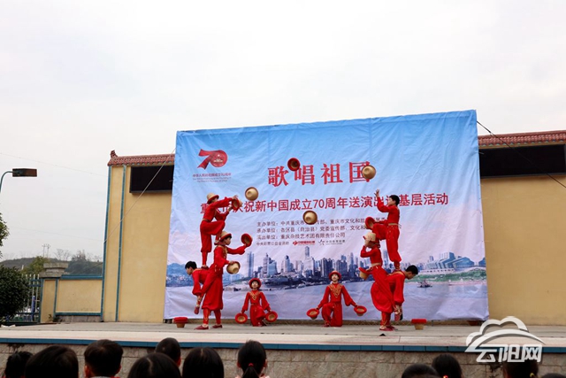 云陽網(wǎng)訊(通訊員 萬柯言)近日,由重慶市委宣傳部、重慶市文旅委主辦的“歌唱祖國—重慶市慶祝新中國成立70周年送演出進基層活動”在桐林小學校開展,重慶雜技藝術團帶來雜技,受到全校師生和家長的熱情歡迎。