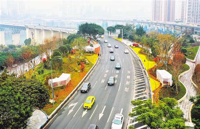 江北區(qū)建新南路,嘉陵江大橋北橋頭公園扮靚了城市街道。記者 崔力 攝