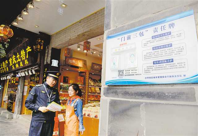 沙坪壩區(qū)磁器口,商家門口張貼著“‘門前三包’責任牌”。記者 張錦輝 攝