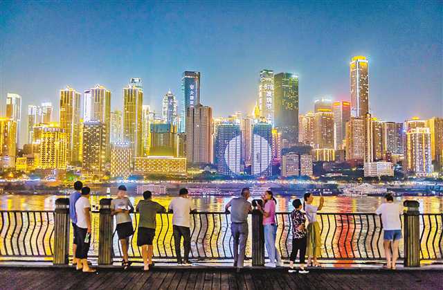 市民正在南岸區(qū)南濱路煙雨廣場欣賞山城夜景。記者 龍帆 攝