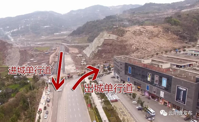 據(jù)施工單位介紹,本次即將要通車的道路是約1.7公里的單行雙車道,從云陽(yáng)高速下道至億聯(lián)方向,所有車輛只能從這條道路進(jìn)城。