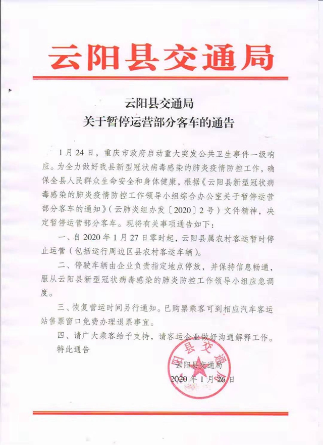 一、自2020年1月27日零時起,云陽縣屬農(nóng)村客運暫時停止運營(包括運行周邊區(qū)縣農(nóng)村客運車輛)。